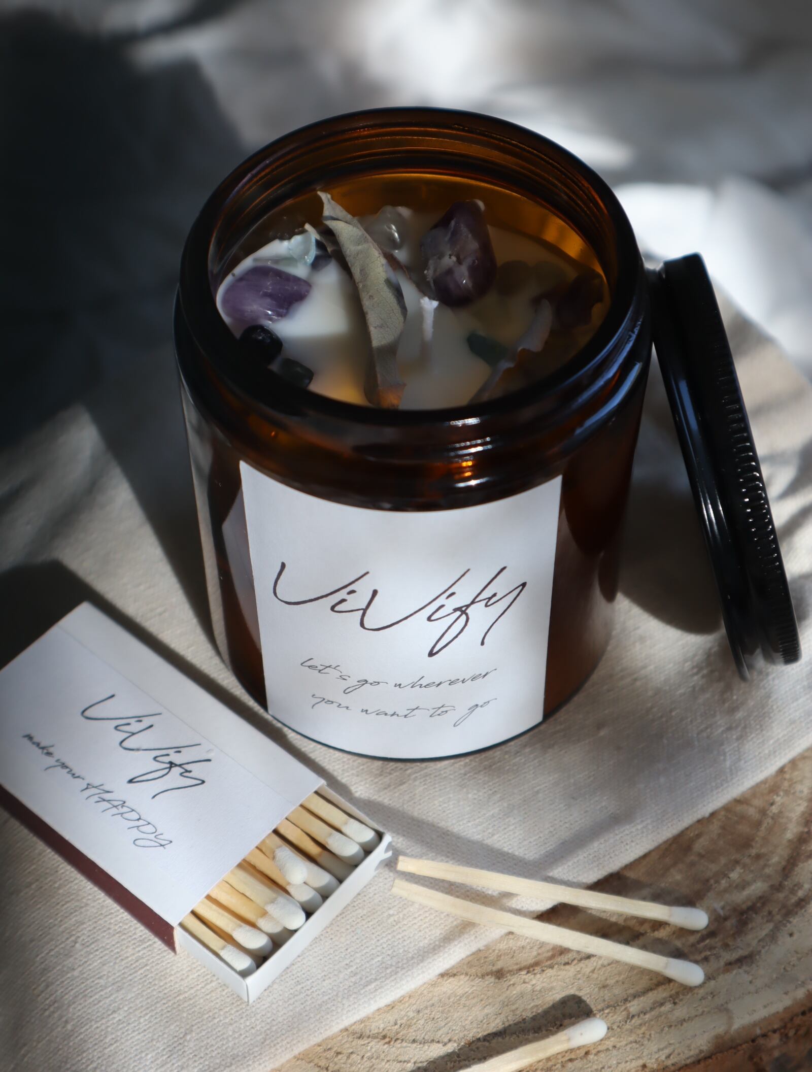 持ち運びしやすいコットンの巾着袋とマッチがセットになっています。
